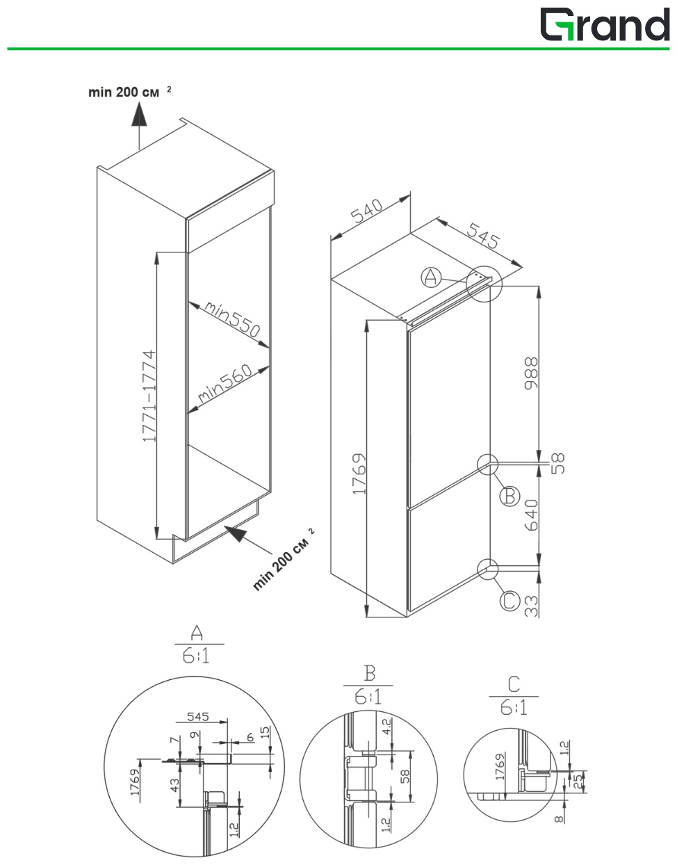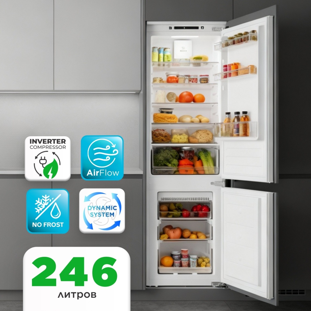 Встраиваемый холодильник GRAND GNBF-246NFFO — функциональная модель для кухни с установкой в мебельный гарнитур. Холодильник сочетает тихую работу, инверторный компрессор и современную систему охлаждения, обеспечивая стабильную температуру хранения продуктов.