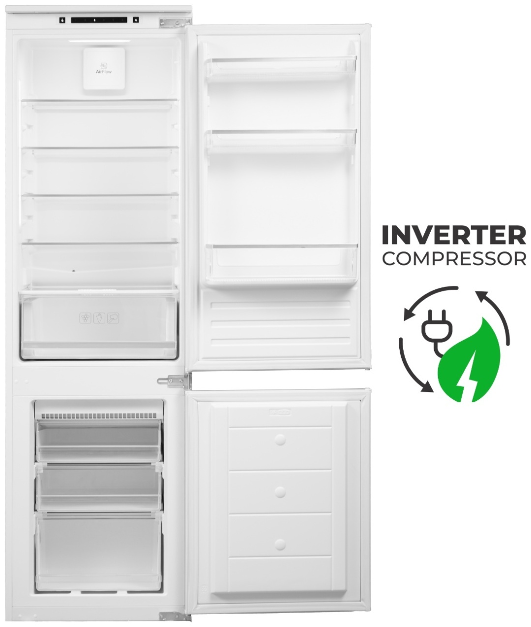 В холодильной камере применяется динамическая система охлаждения Air Flow, равномерно распределяющая холодный воздух по всем полкам. Морозильная камера работает по технологии No Frost, предотвращая образование льда и избавляя от необходимости ручной разморозки.
