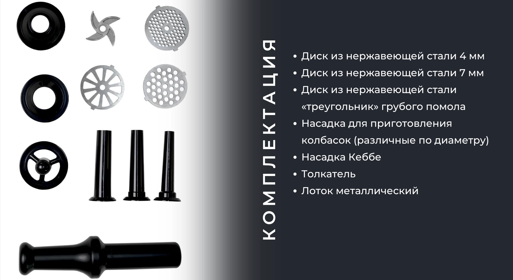 Функция реверса помогает быстро устранить застрявшие продукты, а две скорости позволяют подобрать оптимальный режим для мягкого или плотного мяса. В комплект входят решётки для разного типа фарша, насадки для колбас и кеббе — можно готовить домашние полуфабрикаты и мясные деликатесы.