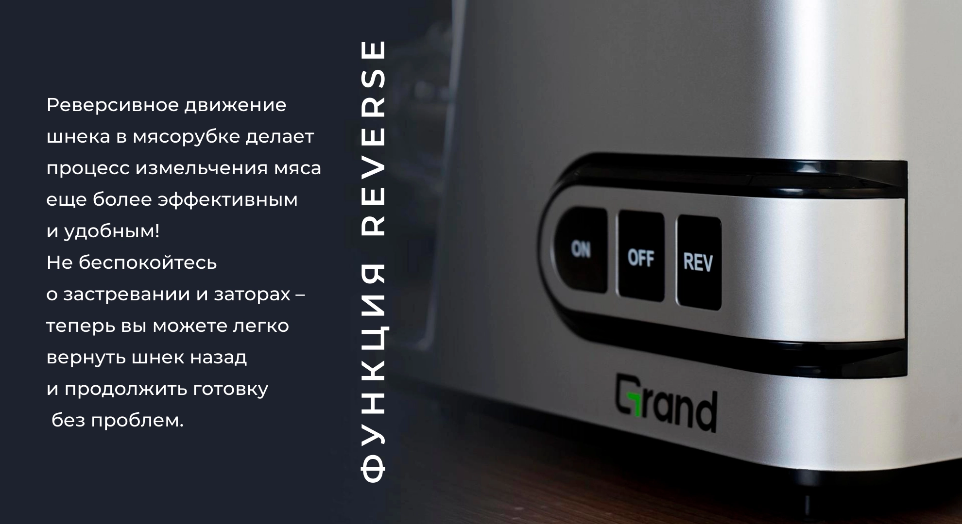 Защита двигателя от перегрева, нескользящие ножки и место для хранения шнура делают использование безопасным и удобным. GRAND GAMG-8096SMEM — практичный выбор для кухни, где важны мощность, долговечность и стабильная работа техники.