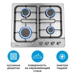 Газовая варочная поверхность Midea MG6040BSS — надежный и функциональный выбор для вашей кухни, сочетающий стильный дизайн и простоту использования. ? Особенности:- ? Автоматический электроподжиг — мгновенное и удобное включение конфорок.- ???? Чугунные решетки — обеспечивают устойчивость посуды и долговечность.- ???? Нержавеющая сталь — прочный и легко очищаемый материал. Идеально подходит для приготовления разнообразных блюд в домашних условиях. 4 конфорки позволяют готовить несколько блюд одновременно, а удобные поворотные переключатели делают процесс управления простым и интуитивно понятным.