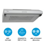 Вытяжка Midea MH60T349W — стильная и практичная модель в белом цвете, которая гармонично впишется в современный интерьер кухни.🔹 Конструкция и управлениеКассетная конструкция с выдвижным стеклянным козырьком помогает направлять воздушный поток. Простое механическое управление делает использование максимально удобным и надежным.🔹 Мощность и эффективностьБлагодаря двум моторам производительность вытяжки достигает 380 м?/ч, что достаточно для быстрой очистки воздуха даже во время интенсивной готовки.Три скорости работы позволяют регулировать мощность в зависимости от ситуации.🔹 Фильтры и режимыУстройство поддерживает режимы отвода воздуха и рециркуляции. В комплект входят:жироулавливающий фильтр,два угольных фильтра для устранения запахов.🔹 Комфорт в использованииУровень шума — до 71 дБ.Светодиодное освещение (1,5 Вт) обеспечивает хорошую подсветку рабочей зоны.Компактная длина шнура 85 см упрощает подключение.? Midea MH60T349W — это сочетание функциональности, надежности и лаконичного белого дизайна, которое подойдет для любой кухни.